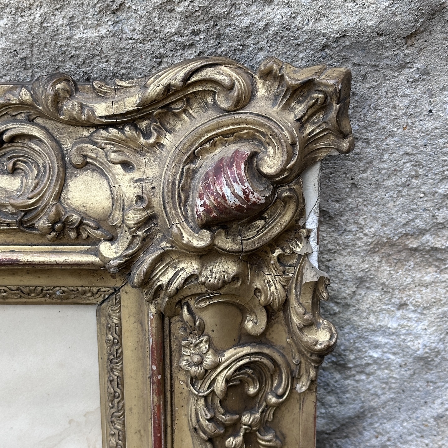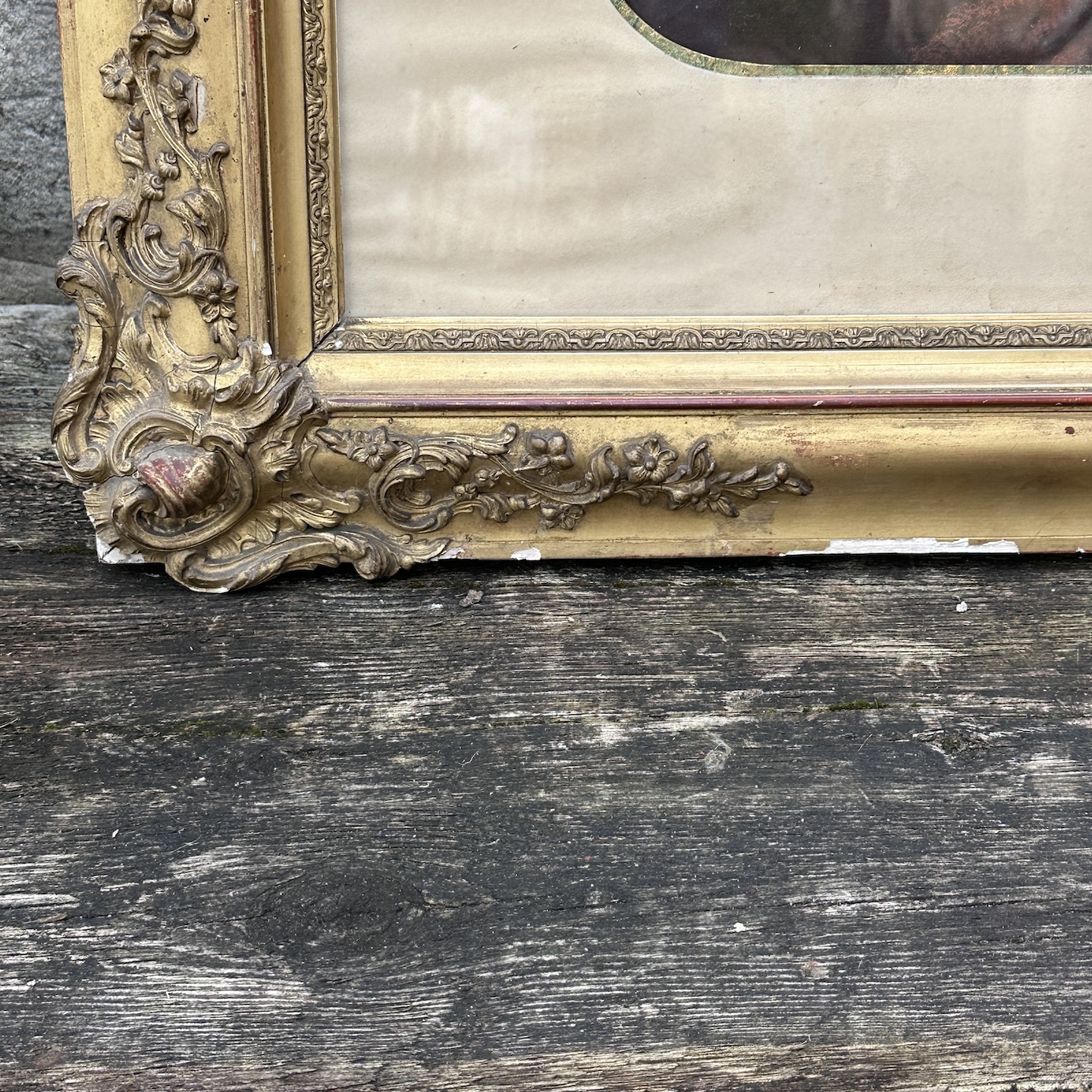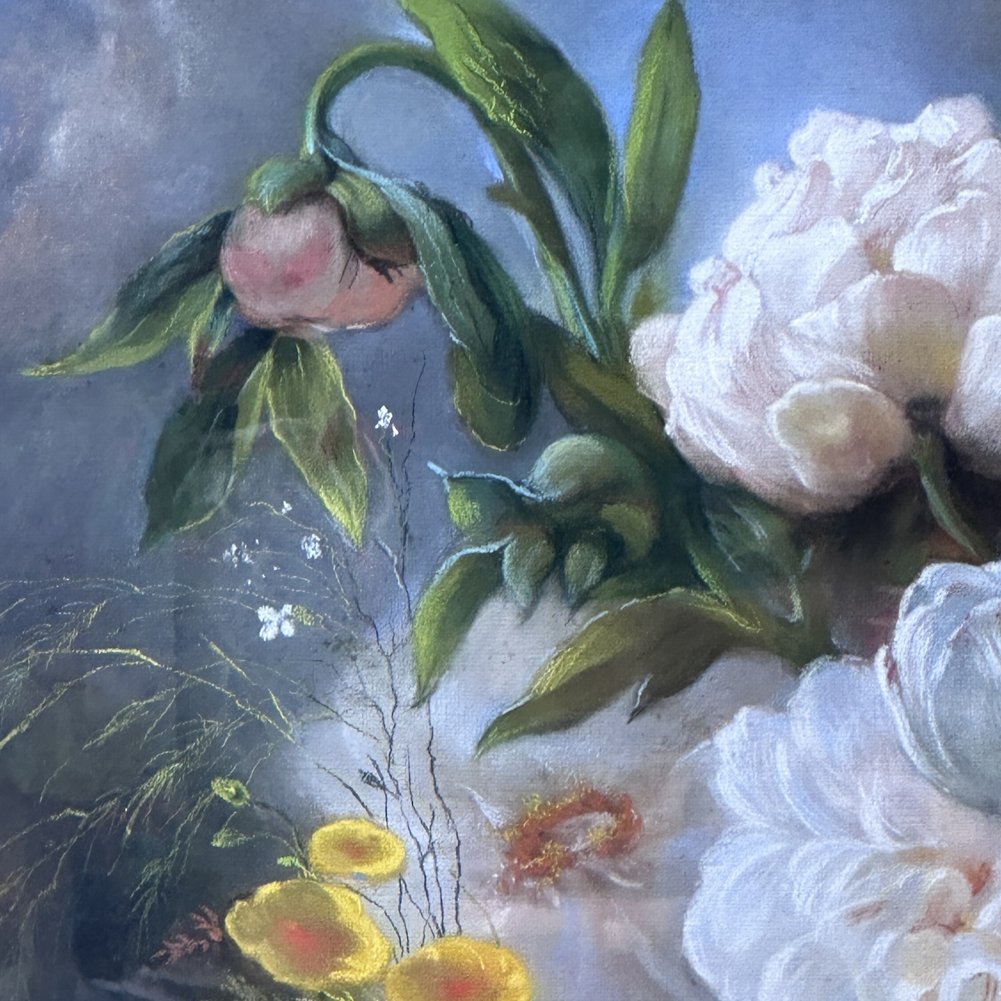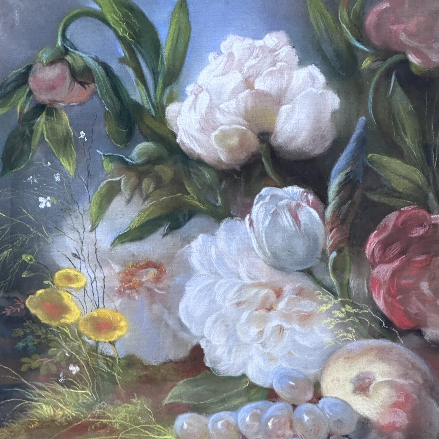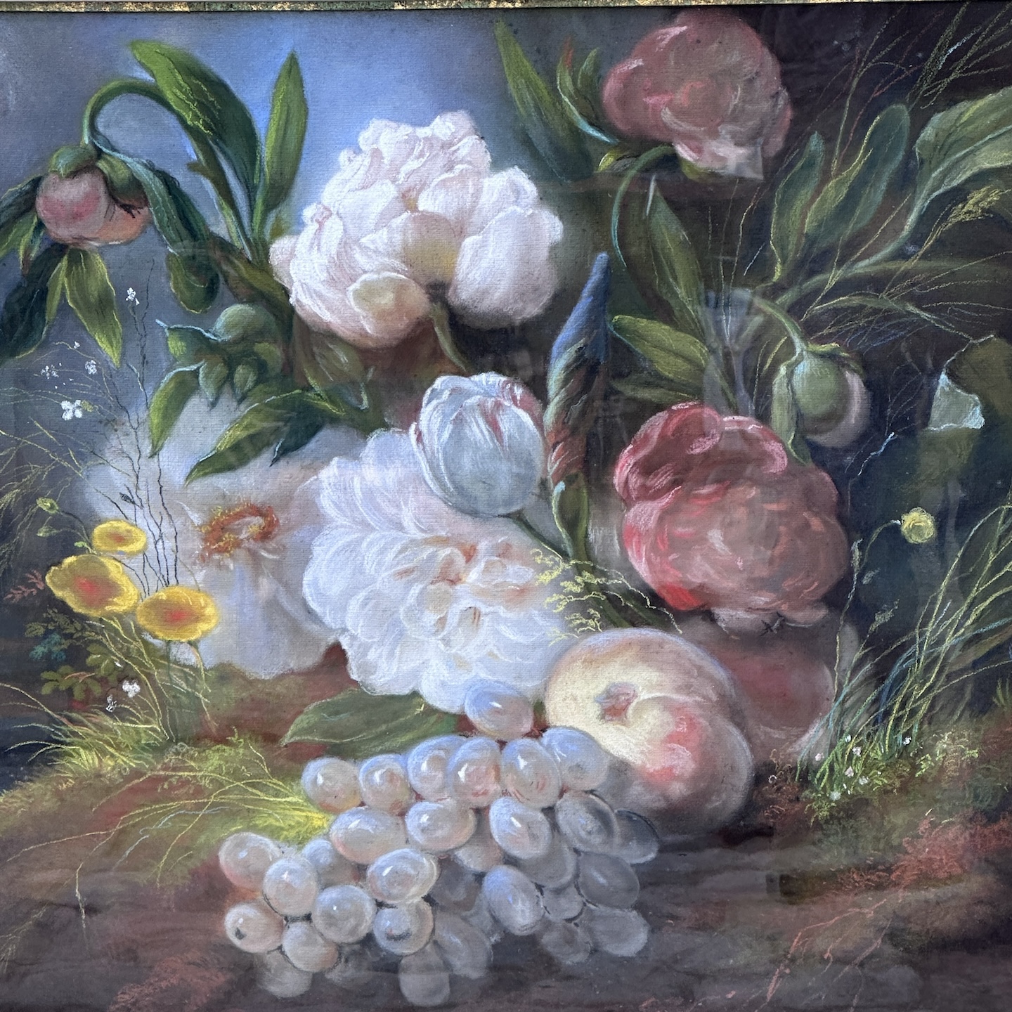 Large late 19th century pastel still life depicting flowers and fruit in an outdoor setting. Wooden and stuccoed frame to be restored.