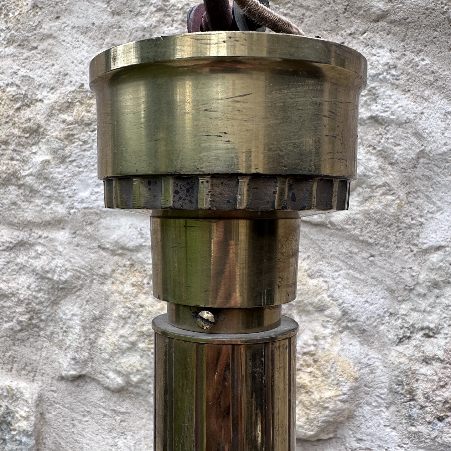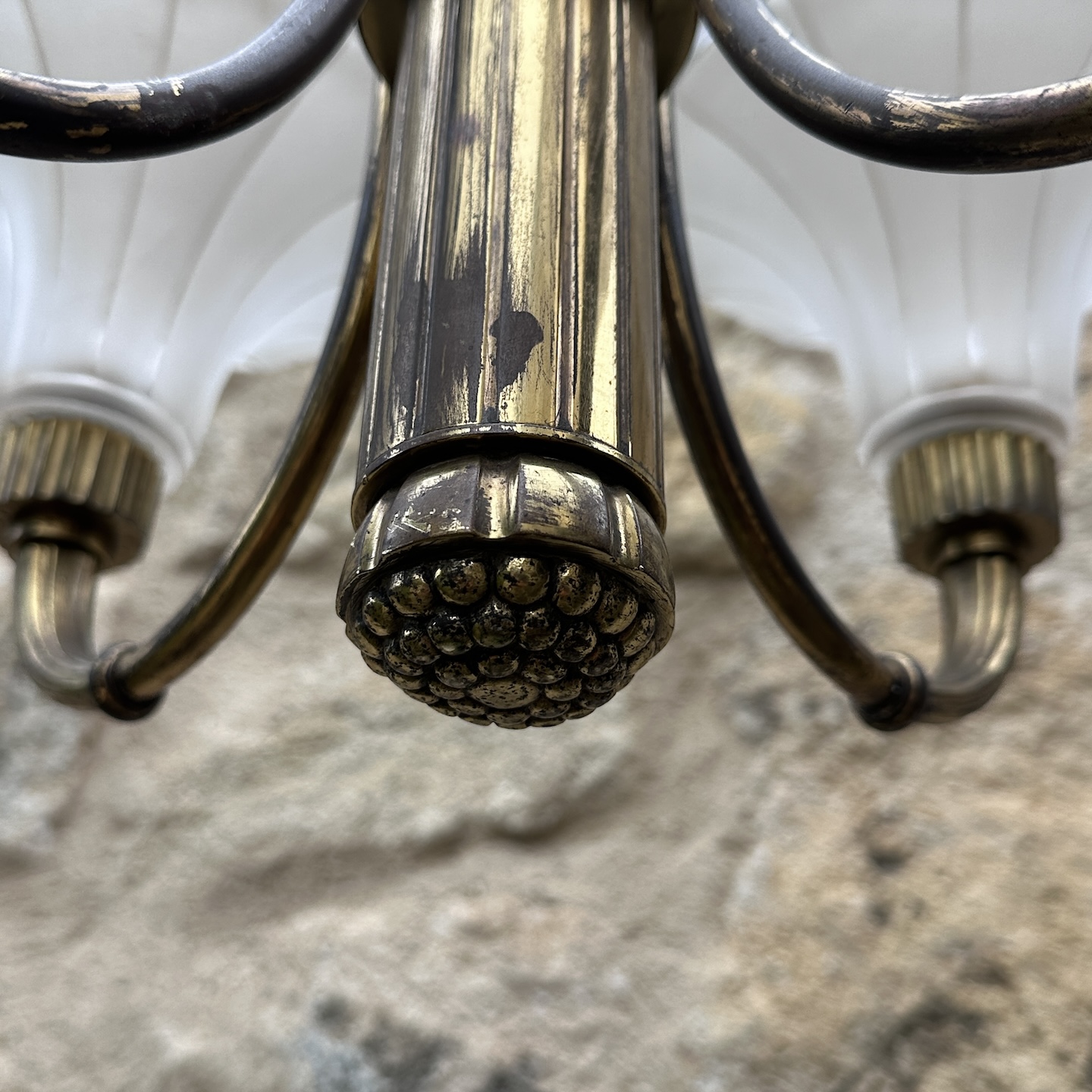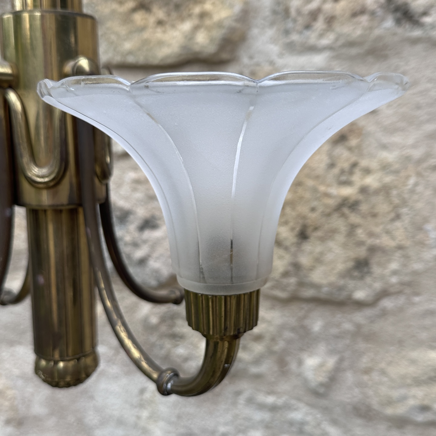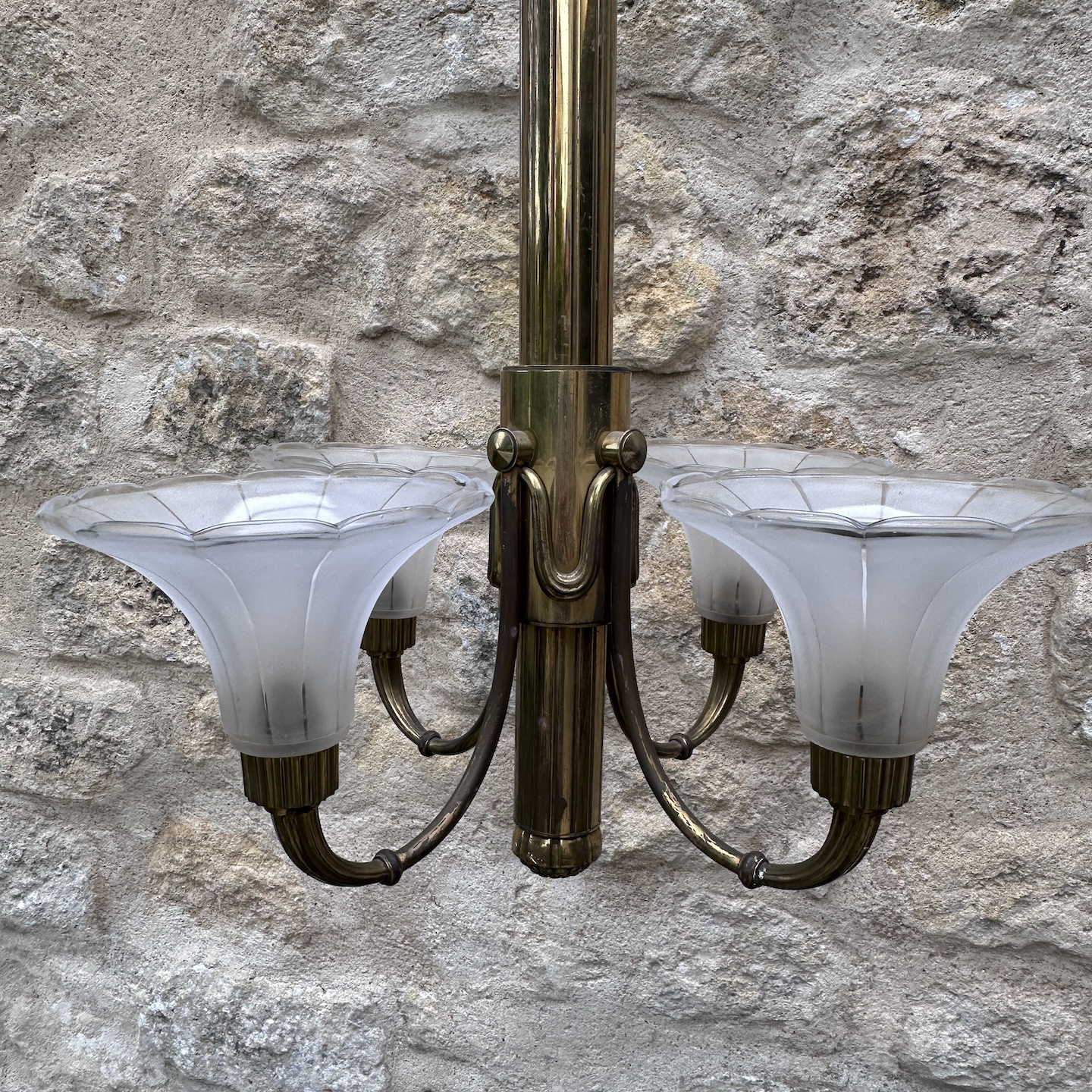 Lustre Art déco en bronze et verre moulé-pressé dépoli de l’atelier Petitot. Electricité à refaire. Vers 1930.