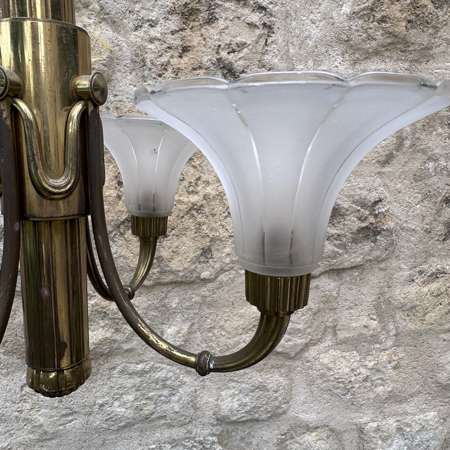 Art Deco chandelier in bronze and frosted molded-pressed glass from the Petitot workshop. Requires rewiring. Circa 1930.