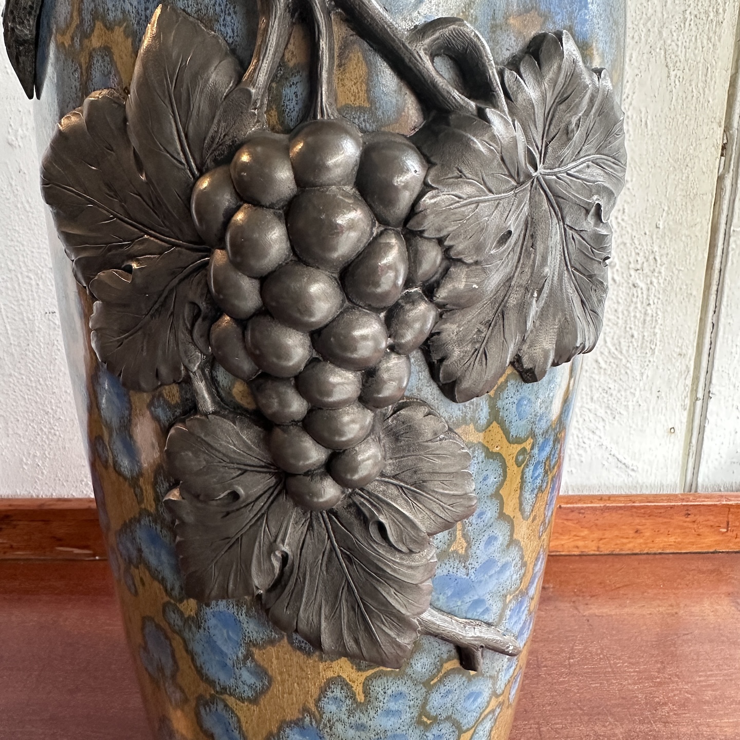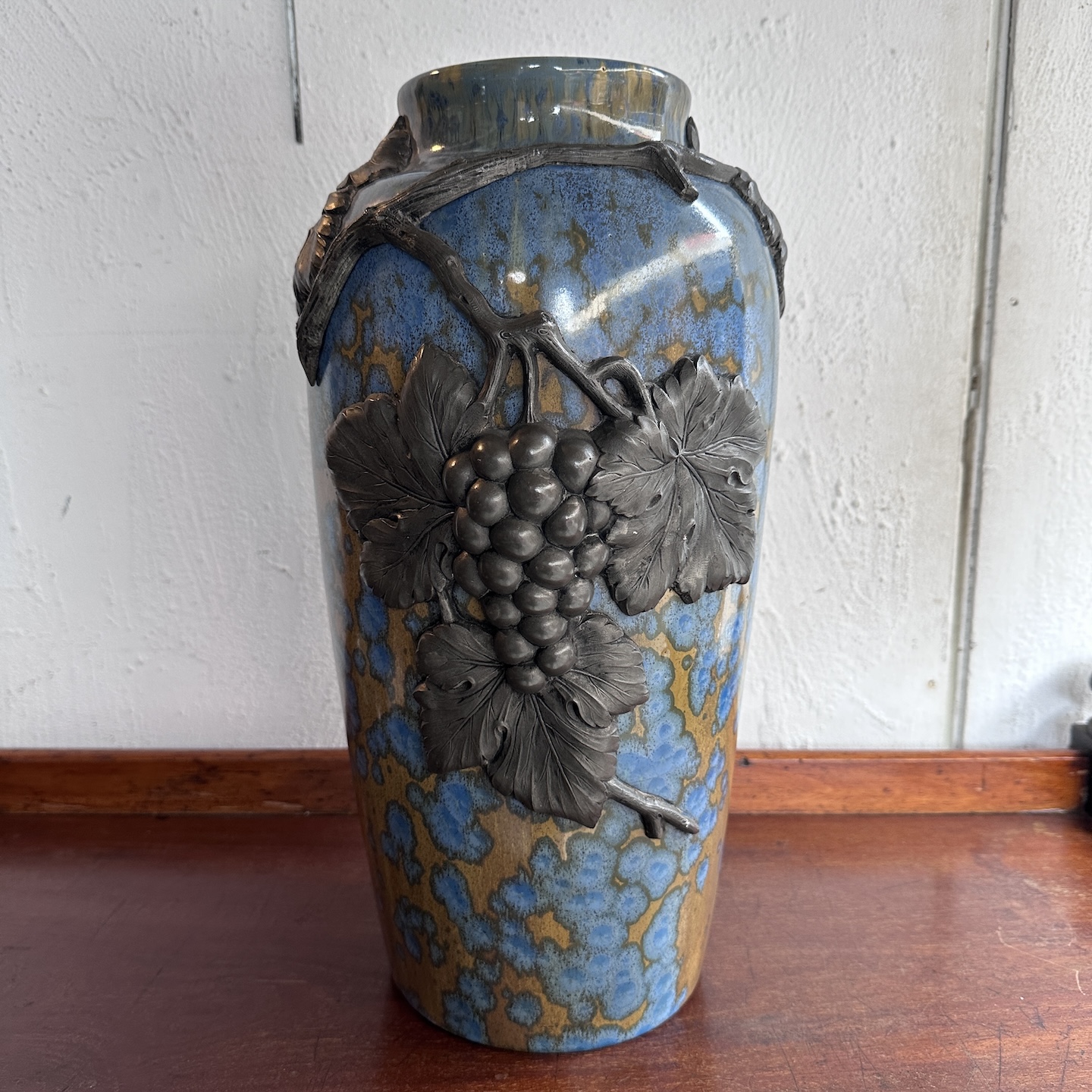 Grand vase art déco en grès agrémenté d’une parure d’étain en application à décor de grappes de raisins et sarments de vigne. Glaçure à cristallisations. Faïence Héraldique et marqué Pierrefonds, marque au heaume de chevalier entre les lettres F et H. Vers 1900/1930. Parfait état.