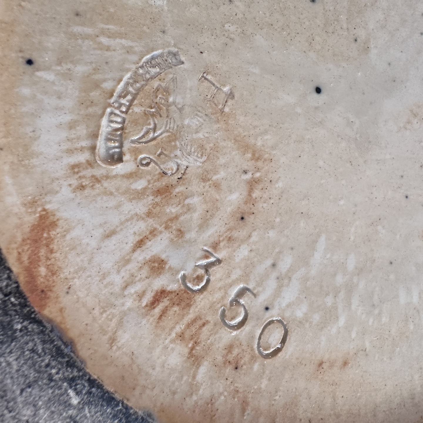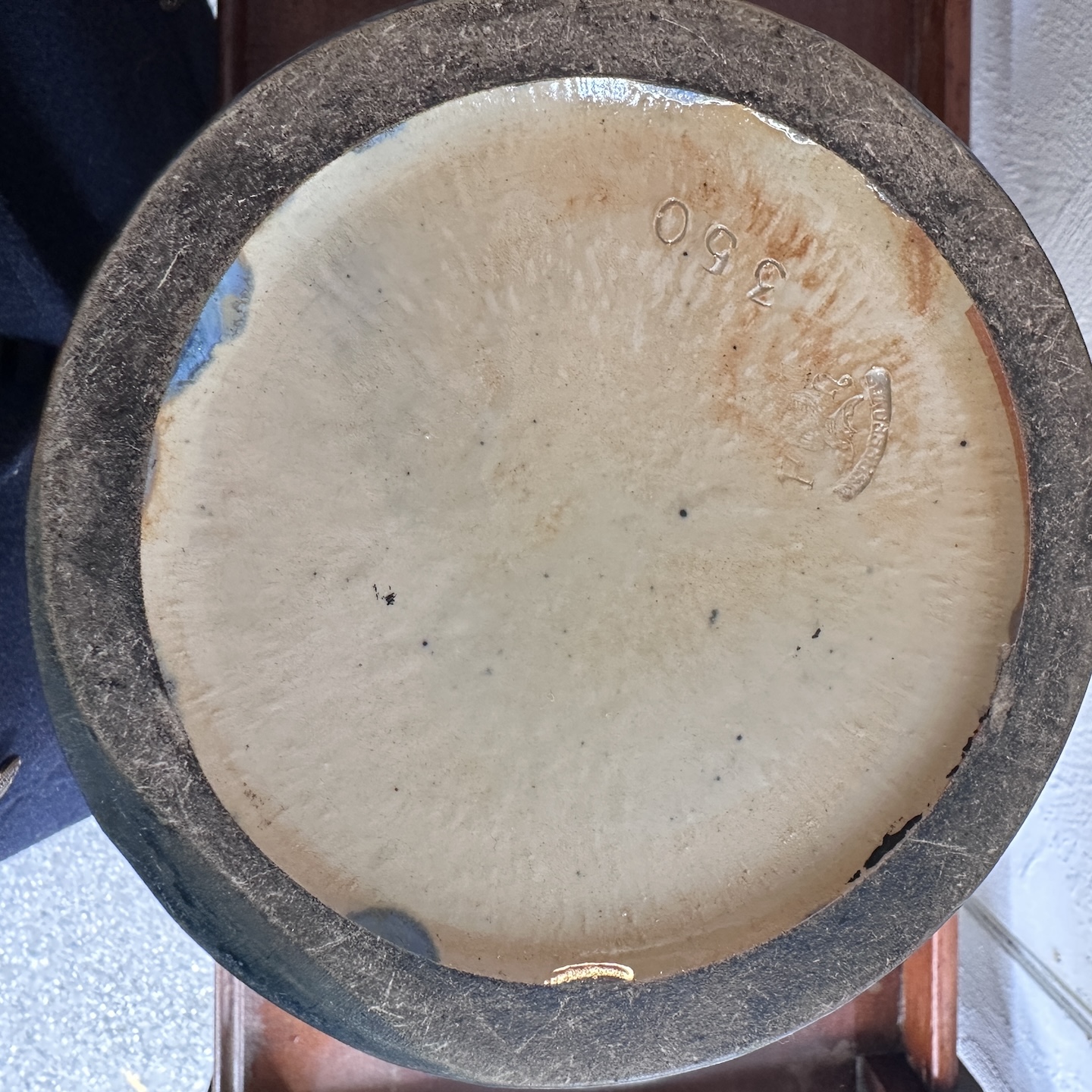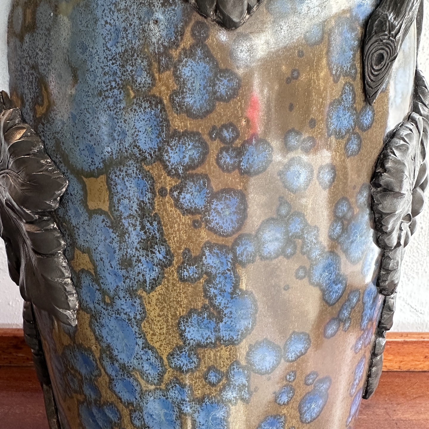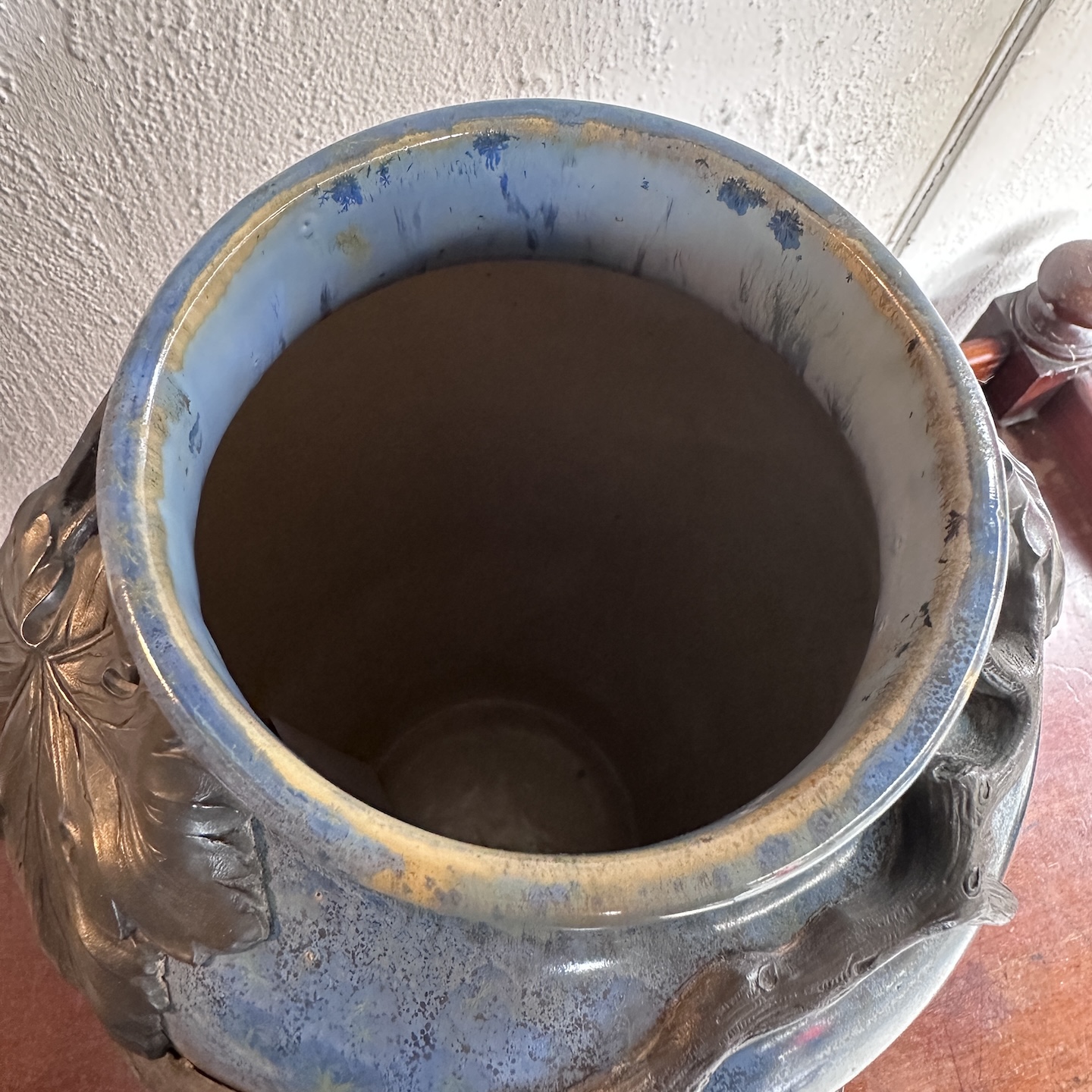 Large art deco sandstone vase decorated with a pewter ornament decorated with bunches of grapes and vine shoots. Crystallization glaze. Heraldic earthenware and marked Pierrefonds, mark on the knight’s helm between the letters F and H. Around 1900/1930. Perfect condition.